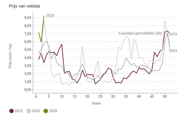 Head lettuce dropped to around 0.53 euro/piece in the new year. Lettuces range around 0.70 euros/kg, which is normal for the time of year. Boerenbond notes in a brief analysis of the market situation. The price for lamb's lettuce reached a peak in week 3 similar to last year. An average of 9.26 euros per kilo was paid last week. An average of 6 euros is common in week 3.