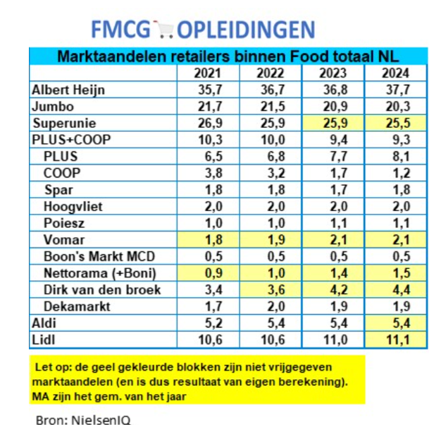 A second reason for the changes in market shares is the fact that NielsenIQ as well as Circana obtained cooperation from Lidl in 2024 and thus 'harder' sales data. Lidl's share in recent years was apparently higher than previously estimated. This led to a correction of the 2023 market shares: Lidl actually had a higher market share and thus the other players had a lower market share.