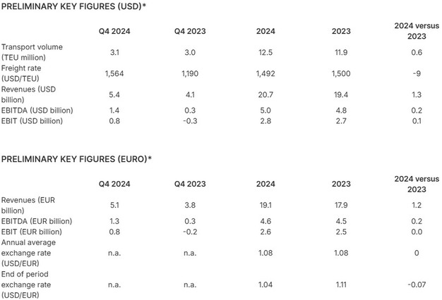 Revenues rose to USD 20.7 billion (EUR 19.1 billion), driven largely by stronger demand for container transport. Transport volumes increased by approximately 5% to 12.5 million TEU, despite the rerouting of ships via the Cape of Good Hope due to the security situation in the Red Sea, which resulted in longer voyage times.