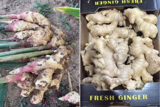 Once ginger is harvested, it is left to dry for a few weeks and then sent to the shed to be cleaned, washed, and packed. The pink on the ginger shows that it is young and the skin will turn brown when the ginger matures.