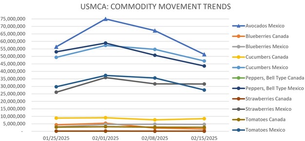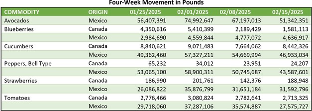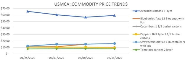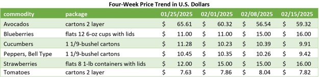 Movement of Chile imports, mostly via boat, through the Philadelphia area port of entry is expected to increase. Trading is moderate. Prices of organics are higher; others are generally unchanged. Flats 12 1-pint cups with lids large are mostly 18.00-20.00; organic Flats 12 1-pint cups with lids large are 30.00-34.00. Quality is generally good. Movement of Peru imports, mostly via boat, through Philadelphia and New York ports of entry is expected to remain about the same. Trading is moderate. Prices are slightly higher. Flats 12 1-pint cups with lids large are mostly 24.00-26.00; Flats 12 6-oz cups with lids large are mostly 14.00-16.00; organic Flats 12 1-pint cups with lids large are 34.00-36.00. Quality is generally good. Movement from Mexico crossings through Arizona, California, and Texas is expected to increase seasonally. Trading is moderate. Prices are higher. Flats 12 6-ounce cups with lids are mostly 14.00-18.00. Quality is variable.
