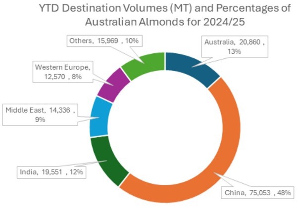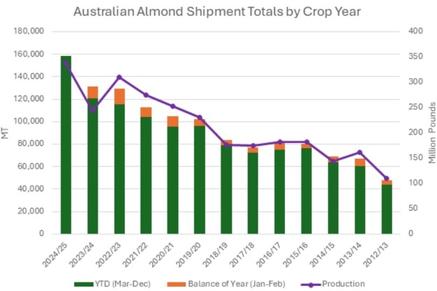 The Almond Board of Australia (ABA) published its December position report on February 14, 2025. The document outlines the volumes and destinations of Australia's almond exports, akin to the Almond Board of California's reports.