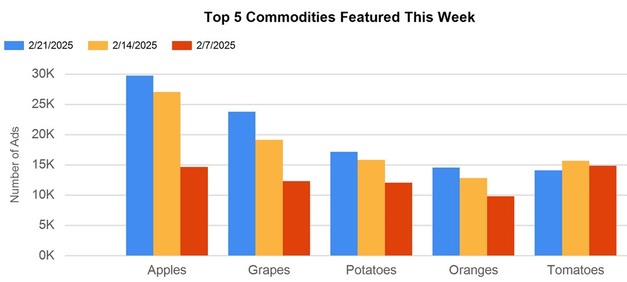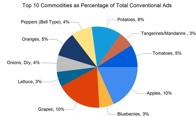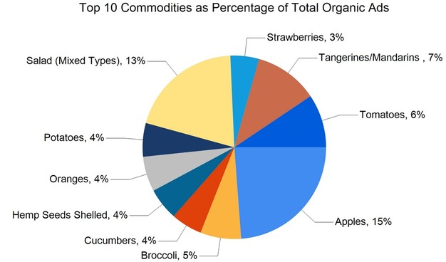 Total ad numbers this week were 282,900, a 1% decrease from last week's total of 286,859. The total for the same week last year was 8% higher at 307,721. The total number of ads broken out by commodity groups: fruit 149,480 (53%), onions and potatoes 26,520 (9%), vegetables 101,865 (36%), herbs 1,169, ornamentals 1,384, and hemp 3,651. The number of ads for organic produce was 37,439, 13% of total ads.