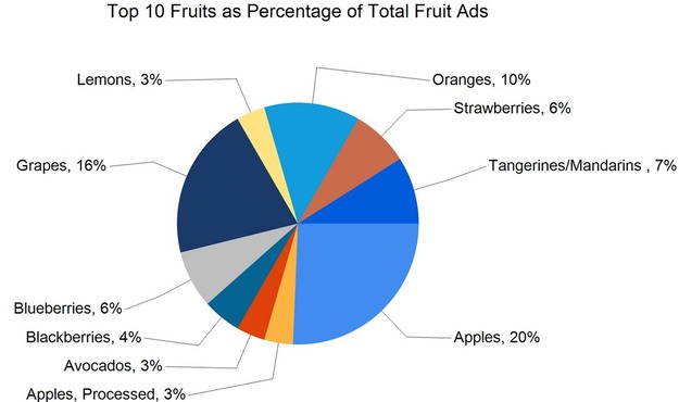The following are the prices of major advertised items (3,000 plus ads) this week, compared to the same week last year. Significant increases in price for fruit this week included only strawberries (1 lb.) at 18%. Significant decreases included seedless grapes (white at 22%, red at 19%, black at 17%), blueberries (1 pint) at 15%, and tangerines (3 lb. bag) at 13%.