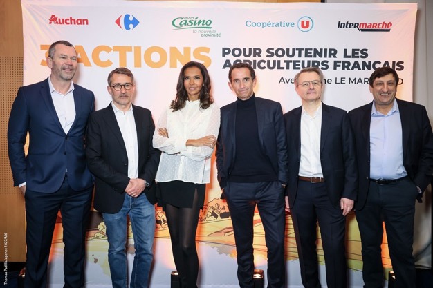 After urging supermarket executives to take concrete action during the C'est Qui le Patron? 8-year anniversary last year, Karine Le Marchand—host of the popular TV show L'Amour est dans le pré—repeated the move yesterday. During a morning press conference, five major retail CEOs—Guillaume Darrasse (Auchan), Thierry Cotillard (Intermarché), Alexandre Bompard (Carrefour), Philippe Palazzi (Casino), and Dominique Schelcher (Coopérative U)—announced three commitments in support of French agriculture. Notably absent was Michel-Edouard Leclerc, raising questions about the depth of this initiative, which some critics dismiss as mere PR.