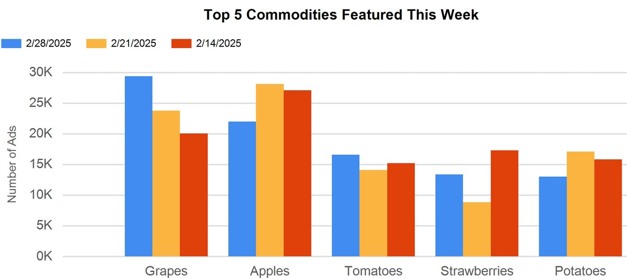 Retailers offered shoppers a helping hand at the checkout this week with deals on produce favorites. Grapes were the most-advertised fruit this week, followed closely by strawberries and blackberries. Russet potatoes, asparagus, and mushrooms were among the most popular vegetables. Imported fruits like peaches, nectarines, plums, mangos, and pineapples brought an air of summertime to produce aisles. Daffodils and tulips brightened floral departments while St. Patrick's Day and Easter décor and gifts filled up seasonal sections.