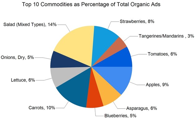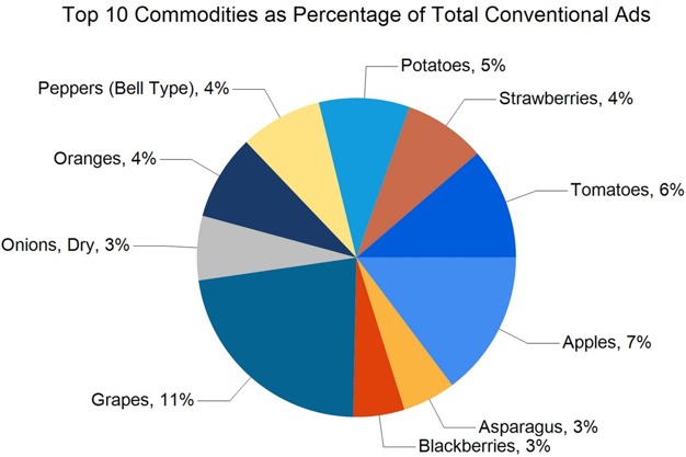 Total ad numbers this week were 290,940, a 3% increase from last week's total of 282,900. The total for the same week last year was 5% lower at 277,043. The total number of ads broken out by commodity groups: fruit 159,352 (55%), onions and potatoes 23,129 (8%), vegetables 106,445 (37%), herbs 1,111, ornamentals 1,194, and hemp 820. The number of ads for organic produce was 33,776, 12% of total ads.