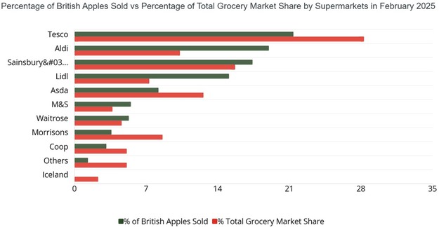 Here's the same monthly data presented as a percentage of all British apples sold, by supermarkets (green line). The red line is a comparison data point of the grocery market share for that supermarket. We would expect the share of British apples sold to be about the same as the supermarket's grocery market share, but some are doing much better than others.