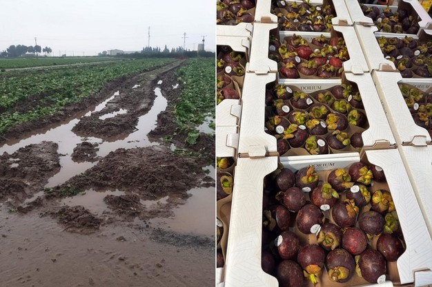 Left: Wet field conditions are affecting fruit and vegetable growth in large parts of Spain. Right: Unusual exotics such as mangosteens and snack lemons are in increased demand in some areas, which is said to be due to short-lived hypes in social media such as TikTok.