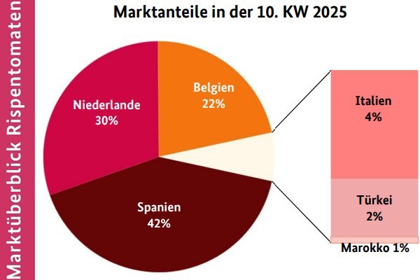 Italian deliveries dominated, with Spanish and French deliveries complementing the scene. In addition, there were still a few Belgian offers, costing €10.50 per 6-pack assortment. In Frankfurt, Spanish, and Italian loads initially fell in price before prices rose again towards the weekend.