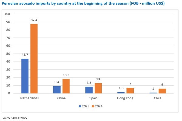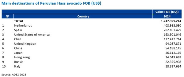 Despite these challenges, Peru achieved a record in agricultural exports, reaching US$12.4 billion in 2024. The Netherlands emerged as a significant destination, with US$1.8 billion in agrarian exports, including US$409 million in avocados.