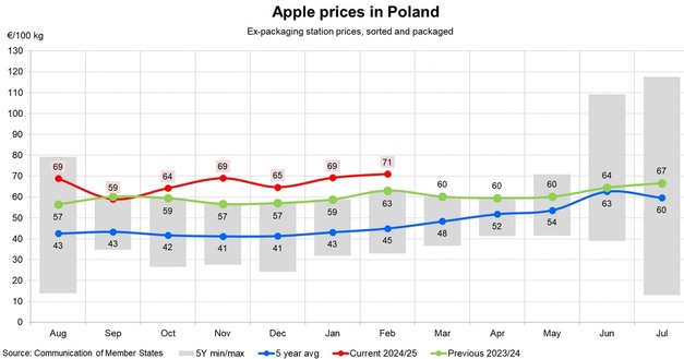 Poland presents a different trend, with winter prices showing a gradual upward trajectory. December prices were at €65/100 kg, rising to €69 in January and reaching €71 in February, marking the highest seasonal levels since the start of the marketing year. This is notably stronger than both the previous season and the long-term average, signaling improved market conditions or reduced supply pressure in Poland's apple sector.