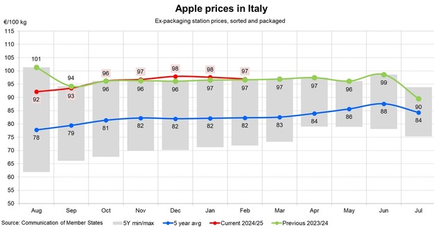 Italy's apple market has remained relatively steady with consistently high prices throughout the season. In December and January, prices held firm at €98/100 kg, dropping only slightly to €97 in February. These levels are comparable to those in the same months of the 2023/24 season and continue to remain significantly higher than the five-year average, suggesting strong domestic and export demand, and possibly lower supply pressures.