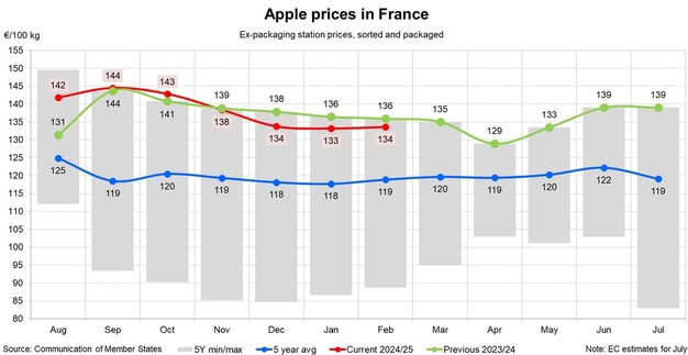 In France, apple prices have gradually declined from the start of the 2024/2025 season but have shown slight stability through the winter months. December prices were recorded at €134/100 kg, followed by a slight dip in January to €133 and then a return to €134 in February. While these values are below the high prices of early autumn, they remain slightly under the 2023/24 levels but still well above the five-year average. The market appears stable, though prices have softened compared to the strong start of the season.