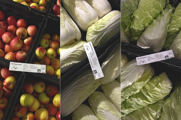 Bioland products from the Biohof Frank from left to right: apples, Chinese cabbage, and pointed cabbage. The company's other organic crops include lettuce, pumpkins, zucchini, sweet corn, and rhubarb. Frank: "We deliberately focus on a wide variety of crops to spread the risks involved in cultivation accordingly." / Picture: Manuel Pentz