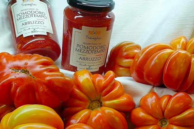 Angelico Travaglini patiently managed to recover the seeds from some local farmers. Thus began the story of his Mezzotempo, a tomato that he managed to market in Italy and abroad (Germany, Holland, and Luxembourg), transforming it into peeled tomatoes and tomato sauce. Among the other outstanding tomatoes is the Pera d'Abruzzo: deep red in color and medium in consistency when fully ripe, roundish or slightly elongated in shape, with more or less pronounced ribs, it can weigh up to 600 grams. The aforementioned Mezzotempo tomato, an ancient ecotype from Vasto in the province of Chieti, in the Abruzzo region, which has recently become a gastronomic reference, is well known for its use in the preparation of the dish 'brodetto alla vastese' (a fish-based soup).