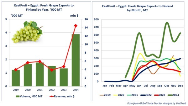 Egypt has experienced an escalation in fresh grape exports to Finland, according to EastFruit. By the end of 2024, Egypt delivered 3.8 thousand tons of grapes to Finnish markets, valued at over $14 million. This volume is nearly threefold compared to 2023, marking a new point in Egypt- Finland trade relations.