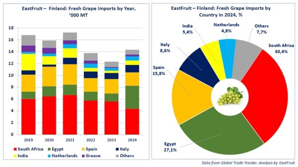 South Africa remains Finland's main grape supplier and ranks among the top three global grape exporters. South African and Indian shipments mainly occur in the year's first half. Conversely, Egypt's export season to Finland typically runs from May to December, placing Egyptian grapes in direct competition with those from Spain, Italy, and the Netherlands.