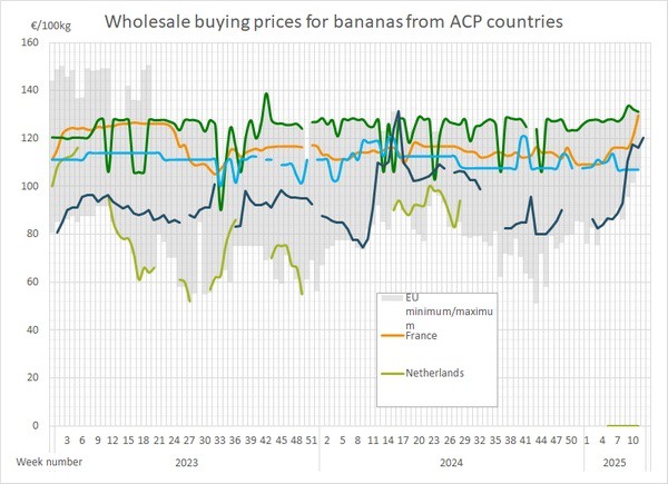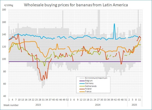 Hungary (HU) also saw an increase in the average wholesale price of bananas from Latin America and the Caribbean. For the week ending 16 March 2025, the price stood at €135 per 100 kilograms. By the following week, ending 23 March 2025, the price had risen to €139 per 100 kilograms. This €4 increase, while more modest compared to other countries, still reflects an upward trend in the Hungarian banana market during this period.
