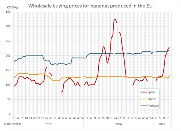 Latvia (LV) also experienced a significant rise in banana prices during the same period. The average wholesale price increased from €108 per 100 kilograms in the week ending 16 March 2025 to €119 in the following week. This €11 increase reflects one of the sharpest week-on-week changes among the countries listed.