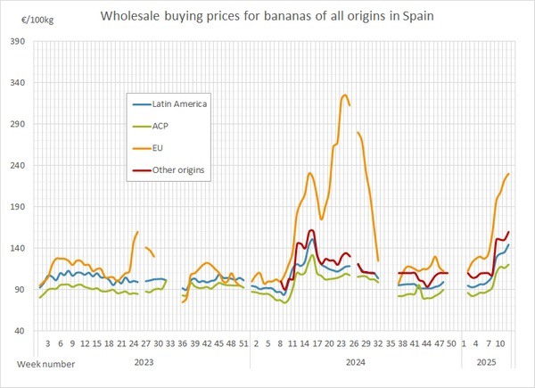 In the week ending 23 March 2025, Spain (ES) recorded an increase in the average wholesale price of bananas from Latin America and the Caribbean, rising to €144 per 100 kilograms from €135 the previous week. This marks a €9 increase in just one week, representing a notable change in banana pricing within the Spanish market.