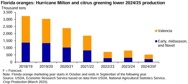 The most recent Florida all-orange crop forecast (March 2025) for 2024/25 is 522,000 tons, down 35 percent from the 2023/24 final utilized total of 808,000 tons. If realized, the 2024/25 Florida orange crop would be the smallest in 95 years. The USDA, National Agricultural Statistics Service (NASS) Crop Production report forecasts that Florida's combined early, midseason, and Navel orange production and Valencia orange production will fall 32 and 38 percent, respectively, compared to 2023/24.