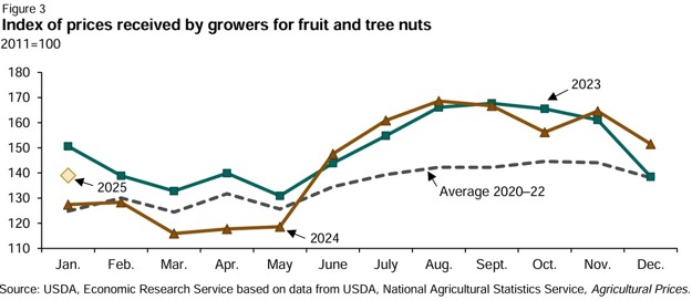 In January 2025, the index of prices received by growers for fruit and tree nuts was 139 (2011=100), about 9 percent higher than January 2024 but 8 percent lower than January 2023 (Figure 3). As in prior years, prices received by growers in 2024 increased in the late spring and early summer (June through August). This trend partially stems from the seasonal production of fruit and tree nuts. Grower prices for apples, strawberries, and grapefruit were higher in early 2025 than they had been in early 2024. Lower year-over-year volumes for nut crops like almonds, walnuts, and pistachios have also put upward pressure on grower prices.