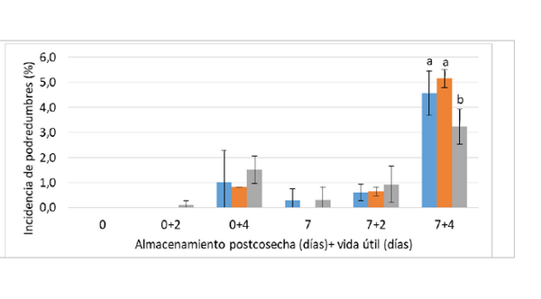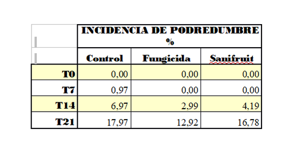Table 1: Incidence of rot in each of the treatments when the fruit has just been taken out of cold storage (1°C) after 7, 14, and 21 days.