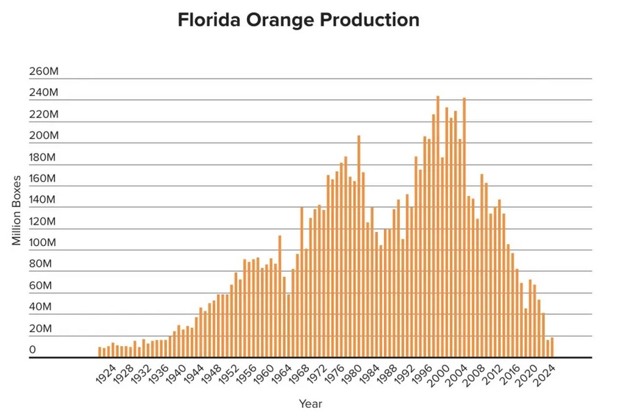 Orange juice, once prevalent in American households, is experiencing a decline amidst challenges such as trade conflicts, climate change, and citrus greening. The U.S. Department of Agriculture forecasts Florida's orange crop to reach pre-World War II levels, with an expected production of just over 11.5 million boxes for the 2024-2025 cycle, marking a decrease of more than 30% from the previous season.