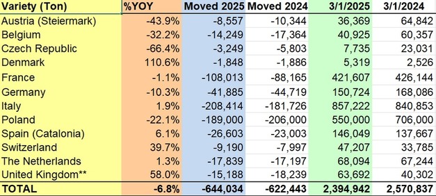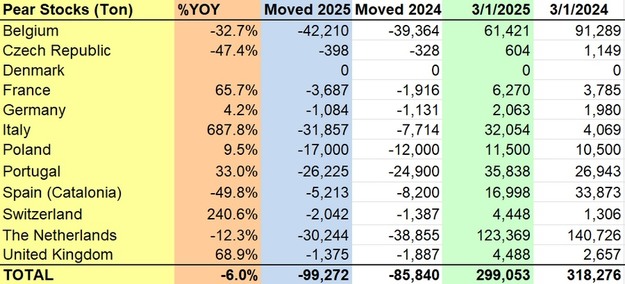 Despite the overall decline, several countries recorded increases in pear stocks. Italy saw the most substantial year-on-year growth, with stocks rising from 4,069 tons in 2024 to 32,054 tons in 2025—an increase of 687.8%. Switzerland and the United Kingdom also reported large percentage increases of 240.6% and 68.9%, respectively. France, Portugal, Poland, and Germany registered more moderate gains, while the Czech Republic showed a continued decrease, with pear stocks dropping from 1,149 to 604 tons.