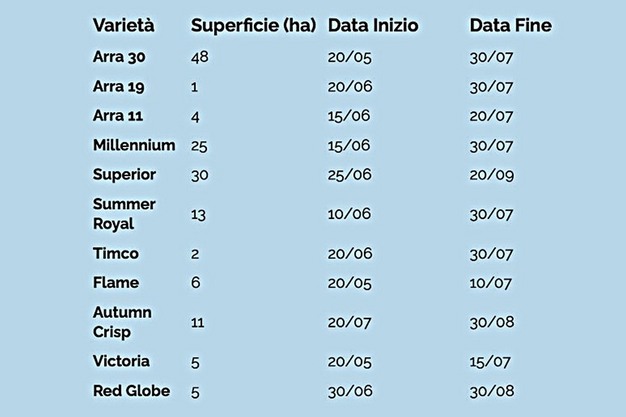 Uva Brunetti specialises in the production of very early seedless table grapes. It was the first company to introduce seedless grapes of European origin to the world market. Harvesting begins around 20 May (although ripening often takes place even earlier) and is over by the end of August. This earliness represents a significant competitive advantage, allowing the company to anticipate production from other geographical areas such as Egypt and Southern Europe, and to position itself in a super niche market. The main varieties cultivated include Arra 30, Arra 19, Arra 11, Millennium, Superior, Summer Royal, Timco, Flame, Autumn Crisp, Red Globe, and Victoria.