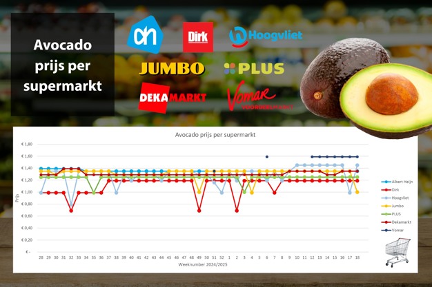 There has been a shift between Hoogvliet and Jumbo. In week 17, Hoogvliet offered avocados for just under one euro each, while in week 18, Jumbo listed them at one euro each. At other retailers, prices range from 1.19 euros (Dirk, the lowest) to 1.59 euros (Vomar) per avocado. Other supermarkets maintain fixed prices between 1.19 euros and 1.59 euros.