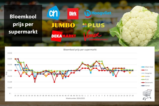 In week 18, cauliflower prices remain relatively uniform, with noticeable differences between regional and national supermarkets. At Dirk, DekaMarkt, and Vomar, cauliflower costs 1.99 euros each. In contrast, AH, Jumbo, and set the price at 2.05 euros each. Hoogvliet, a regional supermarket, aligns with the national price of 2.05 euros per cauliflower.