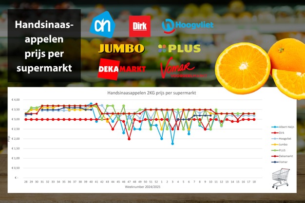 No major changes in the prices of a 2 kg net of oranges. At national supermarkets (Albert Heijn, Jumbo, Plus), the price is uniform at 3.29 euros per net. However, regional supermarkets display slight variations: Dirk (2.99 euros), Hoogvliet (3.19 euros), and DekaMarkt (3.29 euros). Vomar has not had oranges available online since week 11.