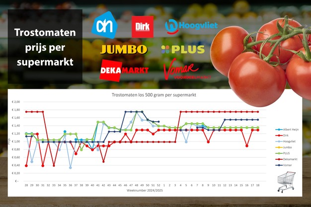 In week 18, there are no special offers on vine tomatoes, with prices remaining stable. The lowest price is at Dirk (1.29 euros for 500 grams), followed by Albert Heijn and Plus (1.35 euros), Vomar (1.55 euros), and DekaMarkt (1.75 euros), which is the most expensive.