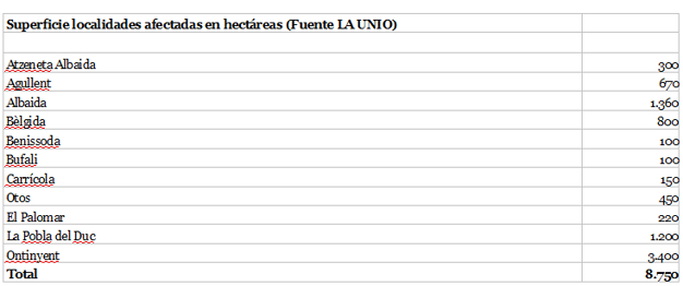 La Unió stated that the current agricultural insurance system covers these weather adversities and that they would ask Agroseguro to speed up the appraisals of the affected plots. The organization will also demand direct aid for those affected, the cancellation of the IBI tax on cultivated plots and buildings on them, a one-year reduction of Social Security contributions, the establishment of loans with subsidized interest rates, and a series of actions and aid for the affected marketing cooperatives.