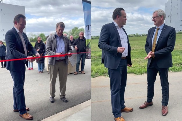 Left: Tasc Germany CEO Lars Willem Köpp and John Forsythe from the One Four Group cut the red ribbon to officially open the test station. Right: Mr. Köpp in conversation with District Administrator Dr. Heiko Blume: