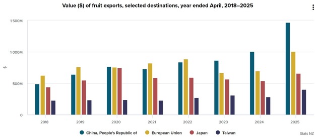 Four primary markets accounted for 65% of the total export value—China, the European Union, Japan, and Taiwan—receiving a combined $3.5 billion worth of fruit. China remained the top destination, with exports valued at approximately $1.4 billion. Gold kiwifruit made up the largest share, with China importing $1 billion worth, followed by apples at $343 million, green kiwifruit at $56 million, and cherries at $19 million.