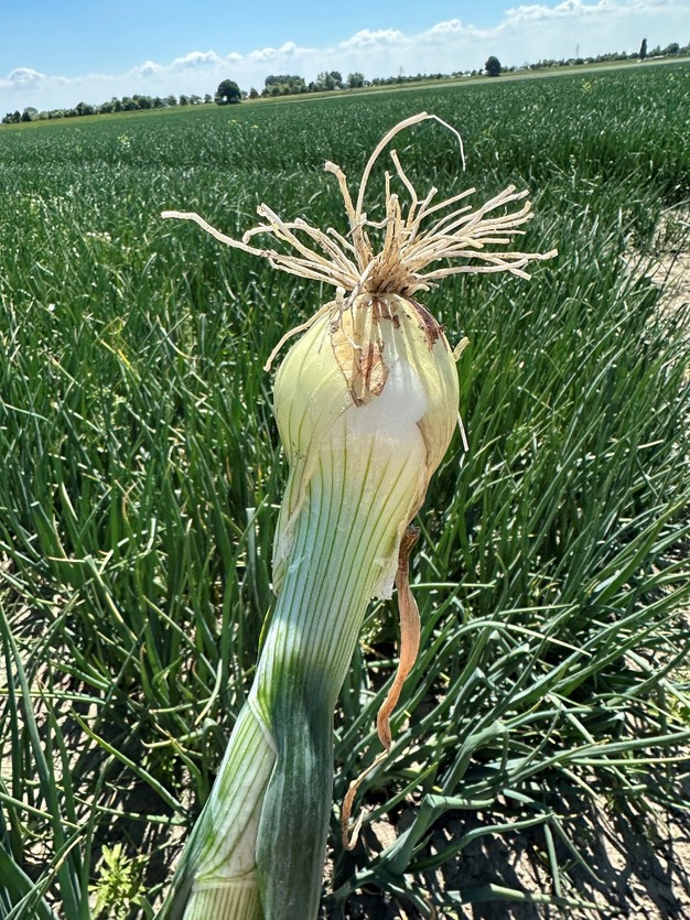 © MSP Onions"What stands out this year is that maintaining top quality has been more difficult for processors than in previous years. Due to the unusual growing season, nearly all batches are losing their skins too easily, often even after sorting. The darker batches are less affected, but customers often find them too dark. Another noticeable issue is that, because of downy mildew, many batches have longer tails than usual. All processors have struggled with this."