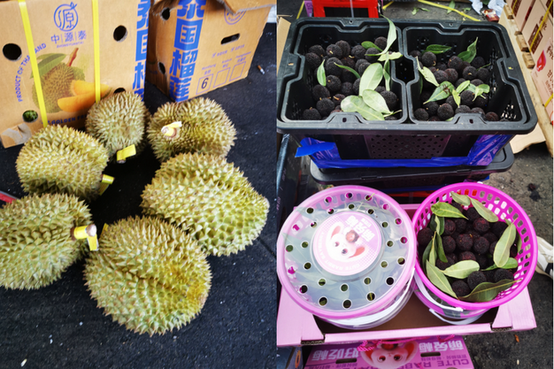 Left: Thai durians; Right: Bayberries