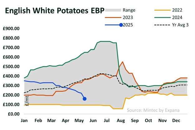 This has led to a steep decline in prices. As of May 20, Expana's Benchmark Price (EBP) for Maris Piper pk exw Eng stood at £160 per metric tonne (mt), marking decreases of 44.8% month-on-month (m-o-m) and 76.1% year-on-year (y-o-y). A similar trend was observed for the white pack exw Eng, with its EBP also at £160/mt, declining by 40.7% m-o-m and 75.4% y-o-y. The severe y-o-y declines are attributed to increased crop availability and larger contracted volumes, a response to the previous scarcity and high prices.