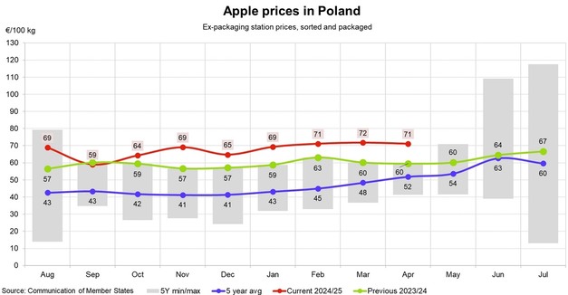 Poland's apple market showed a stable yet elevated pattern, with prices reported at €71/100 kg in February, peaking at €72 in March, and returning to €71 in April. Compared to previous years, these figures place Poland above its five-year average, signaling improved market positioning for Polish growers. Still, prices remain considerably lower than those in Western Europe, reinforcing Poland's role as a competitive supplier in the region.