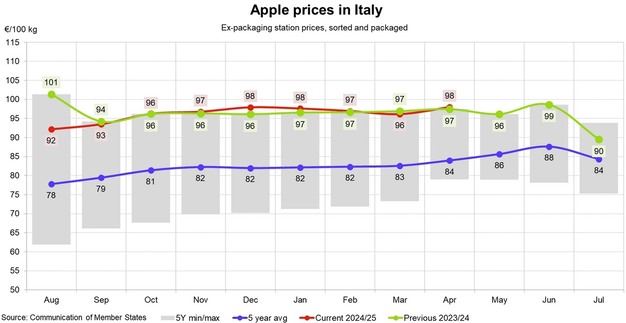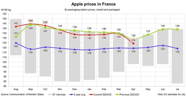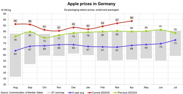 Apple prices across major European producing countries have shown notable differences in the early months of 2024/2025, with Germany reporting the highest increases. In Germany, prices climbed steadily from €84/100 kg in February to €87 in March and reached €89 in April. These values are well above both the five-year average and the 2023/2024 season, suggesting strong market demand or limited supply.