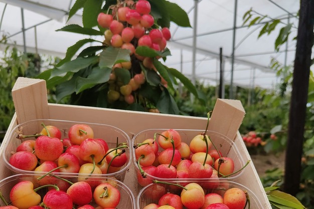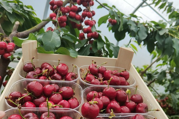 "Moreover, they're grown under protective covers, so there's no dust on them, and the cherries are beautifully shiny. They've also been well pollinated. At first, we were concerned they might not grow thick enough because of the sheer number of trees, but everything turned out very well. We had a dry spring with a north-easterly wind, but we were still able to irrigate properly in the greenhouses, so there was enough moisture during blossom time, and pollination was successful."