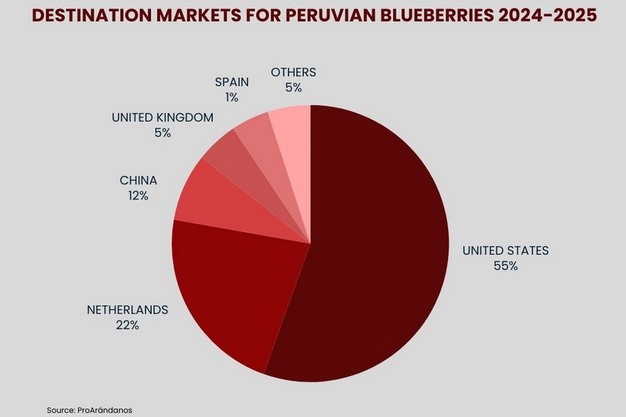 The United States currently accounts for 55% of Peruvian blueberry exports. Next in the ranking of major destinations we have the Netherlands, Hong Kong, the United Kingdom, and China. In this context, Vegas stressed that "it is important to diversify our destinations, logistics, and production window. We shouldn't be so dependent on the port of Callao, or on a single market such as the United States."