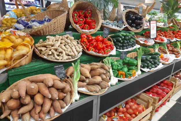 The fruit, on the other hand, is presented more functionally. Many products remain in their cardboard outer packaging and fall short in appearance compared to the vegetable section.