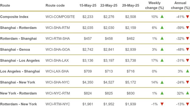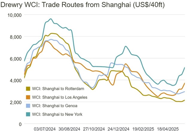 Freight rates from Shanghai to Rotterdam and Genoa have also risen in the past week, by 6% and 3%, respectively.