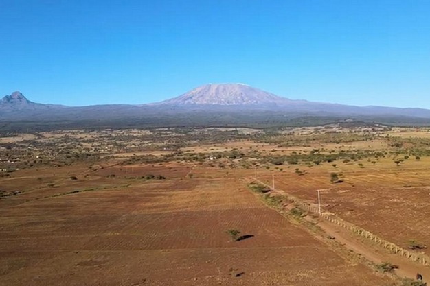 View of the plantations on the Tanzanian border. In the background: Mount Kilimanjaro