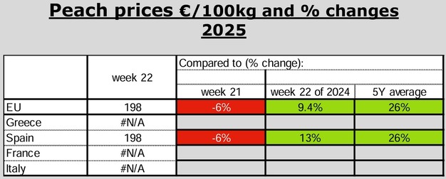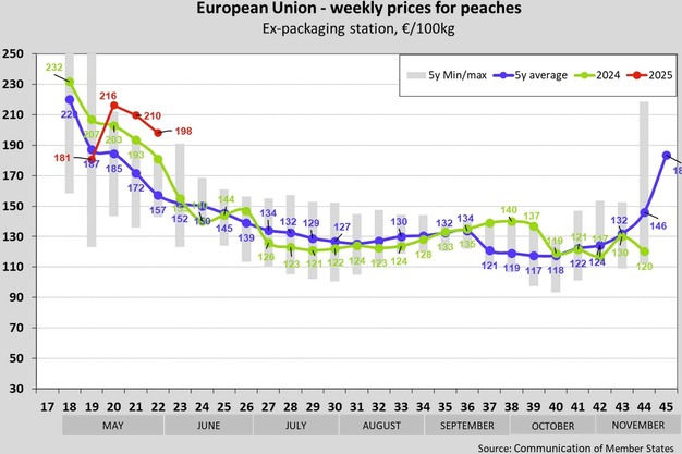 Compared to the same week in 2024, the week 22 price of €198 marks a 9.4% increase at the EU level. In Spain, which is the only country with available data for this period, prices also fell 6% from the previous week but remain 13% higher than the same week last year. This positions current EU and Spanish peach prices approximately 26% above their respective five-year averages.