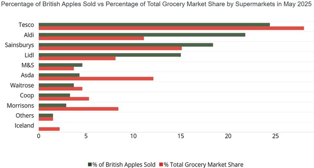 The analysis also compares each retailer's share of British apple sales with their total grocery market share. In theory, these shares should align, but the data reveals notable differences, with some supermarkets selling significantly more British apples relative to their size, while others lag.